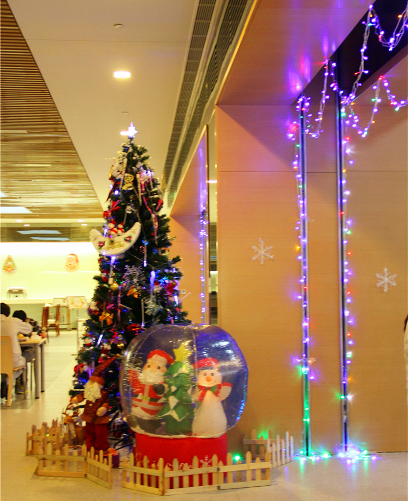12月25日中午,行政办公室将员工餐厅精心布置了一番。餐厅里挂满了闪亮的灯,墙壁上也应景的贴上了圣诞快乐的祝福语,电视上播着世界各地欢庆圣诞节的幸福画面,耳边回荡着充满节日氛围的欢快音乐。